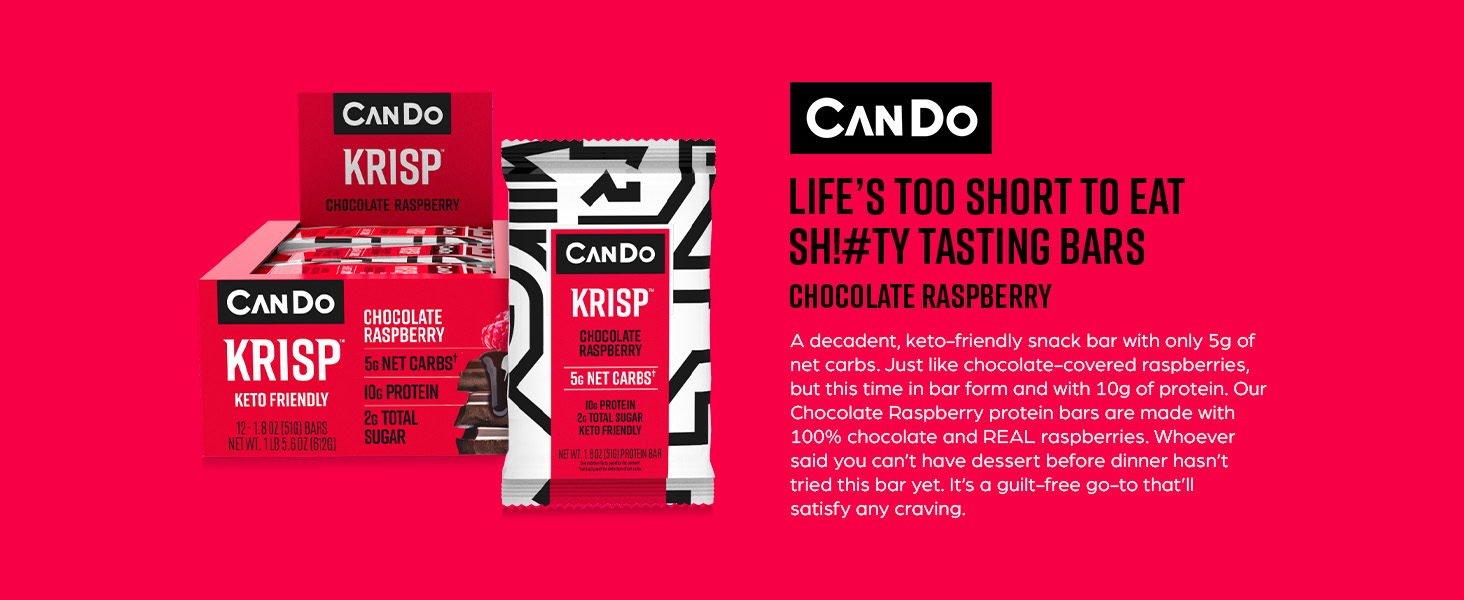 CanDo Krisp's Chocolate Raspberry Keto Snack Bars are a low-carb, high-protein treat designed for health-conscious individuals. Each bar contains only 5g of net carbs and 10g of protein, making it an ideal meal replacement or snack for those on a ketogenic diet. Made with real ingredients and no preservatives, these gluten-free bars are perfect for on-the-go snacking while supporting a charitable cause.