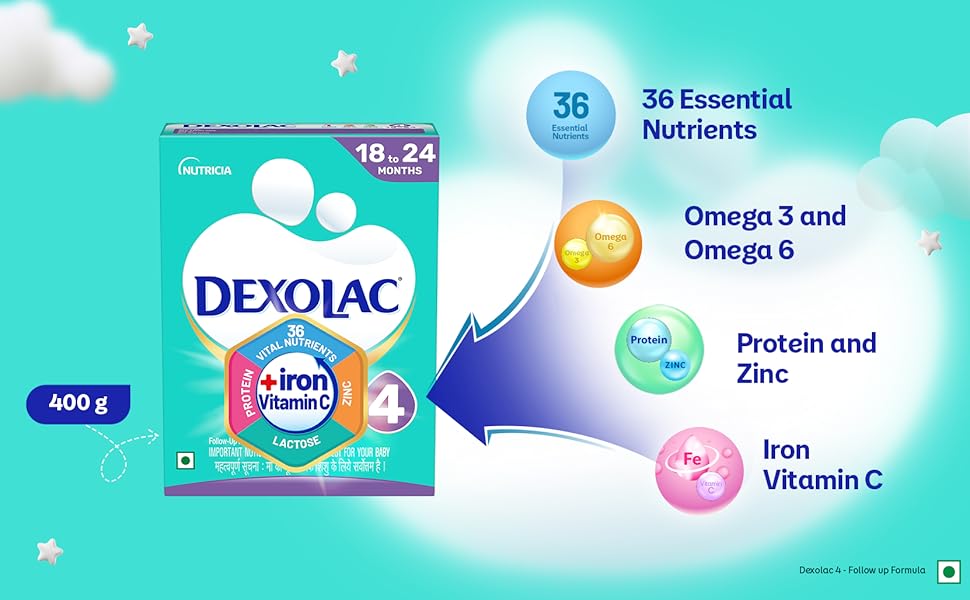 Dexolac Stage 4 Follow Up Infant Formula is a premium milk substitute designed for toddlers aged 18 to 24 months. Enriched with 36 vital nutrients, including Vitamin C and Iron, it supports overall growth and development. Manufactured by Danone, a global leader in nutrition, this formula ensures your little one receives the best nourishment tailored for their developmental stage.