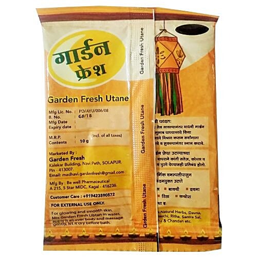 About @import url("https://www.desercart.com/static/froala_style_v2.min.css"); Garden Fresh Utane is a blend of elite herbs for healthy and beautiful skin. Its regular use ensures appropriate nourishment of the skin. This essentially keeps the body free from foul odour and sticky touch. It can be used while bathing. It is 100% pure herbal bathing powder and is free from harmful chemicals. You will enjoy every bit of this sandal perfumed Utane. About @import url("https://www.desercart.com/static/froala_style_v2.min.css"); Made from Natural Herbs, Davana, Kacora, Bavchi, Ritha, Santra Sal, Nagarmotha, Chandan, etc. How to Use @import url("https://www.desercart.com/static/froala_style_v2.min.css"); Use it while bathing. Make a paste of Garden Fresh Utane by mixing it in an adequate quantity of lukewarm water in a bowl. Apply the Utane paste all over the body with a rubbing motion. Wash it with water.
