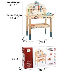 This wooden tool bench for kids is designed to inspire creativity and develop essential skills through imaginative play. Featuring a variety of tools and a safe, eco-friendly construction, it provides a fun and educational experience for children aged 3 and up. With convenient storage and a focus on safety, this workbench is the perfect gift for budding builders.