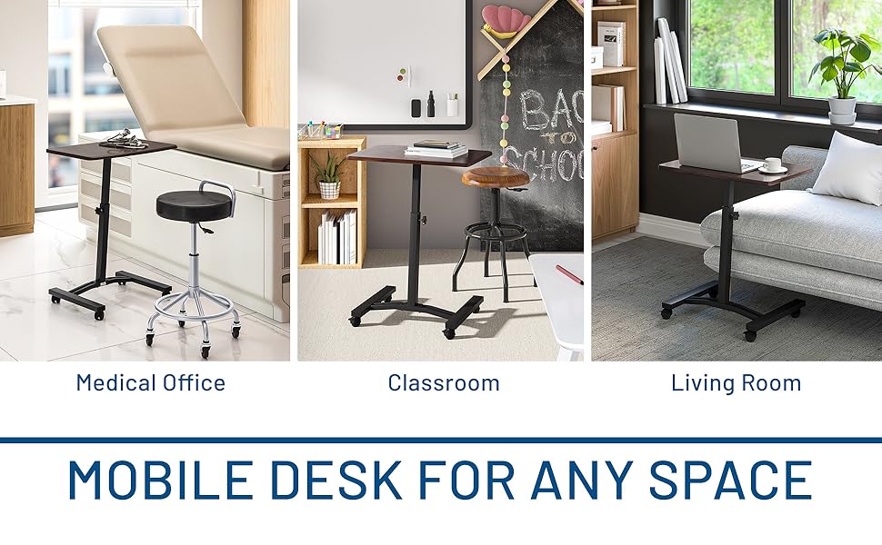 The Seville Classics WEB162 Mobile Laptop Desk Cart offers a height-adjustable walnut tabletop (20.5" to 33") on a sturdy steel frame with four swivel wheels (two lockable) for easy mobility and stability. Its compact design fits most laptops and tablets, making it perfect for flexible, ergonomic work setups at home or office.