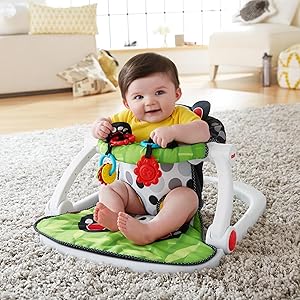 The Fisher-Price Sit-Me-Up Floor Seat is a portable, lightweight baby chair designed to support infants as they learn to sit independently. Featuring a wide, sturdy base and soft foam seat, it ensures stability and comfort. The panda-themed seat includes sensory paws with crinkle and squeaker textures plus two BPA-free linkable toys for developmental play. Its removable, machine-washable seat pad and fold-flat design make it ideal for easy cleaning and travel. Suitable for babies up to 25 lbs who can hold their head up unassisted.