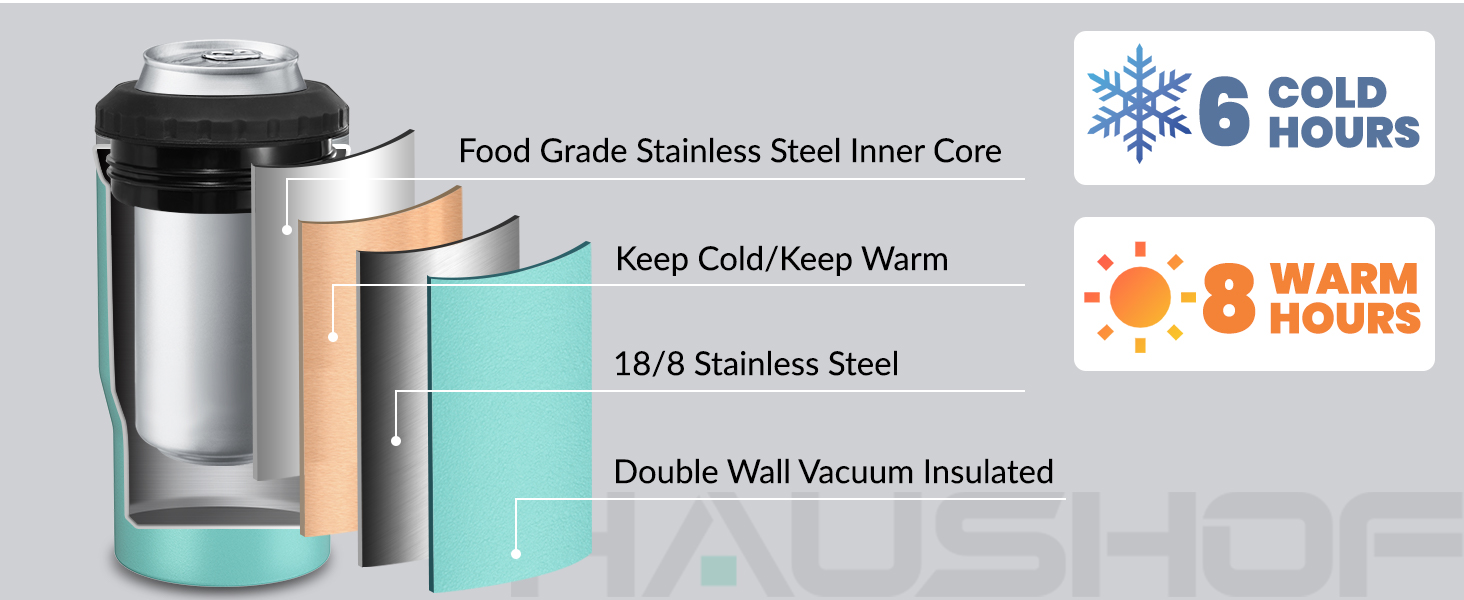 The HAUSHOF 12 oz Can Cooler is a versatile 4-in-1 insulated stainless steel can insulator designed to fit standard cans, slim cans, and beer bottles. With double wall vacuum insulation, it keeps drinks cold for up to 6 hours and warm for up to 8 hours. Its sweat-free exterior ensures a comfortable grip, making it perfect for outdoor activities like camping and picnics.