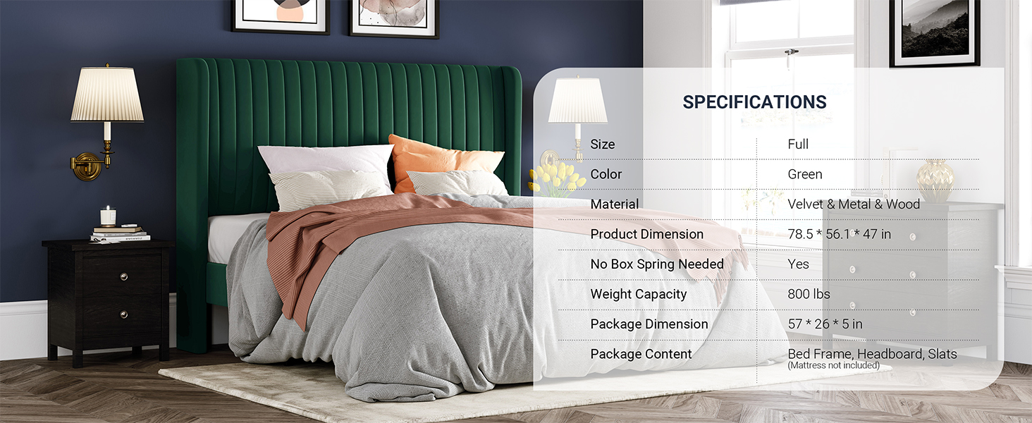 | Special Feature | No Box Spring Needed, Squeak Resistant, Upholstered Velvet Fabric, Vertical Channel, Wingback Headboard |