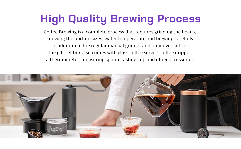 This is an excellent coffee set. The pieces are so well made and it comes with everything you need for fancy pour over coffee. The grinder is easy to use and we are just so impressed with the coffee we make with this set. The packaging is elegant and would make a very nice gift for any coffee fanatic.