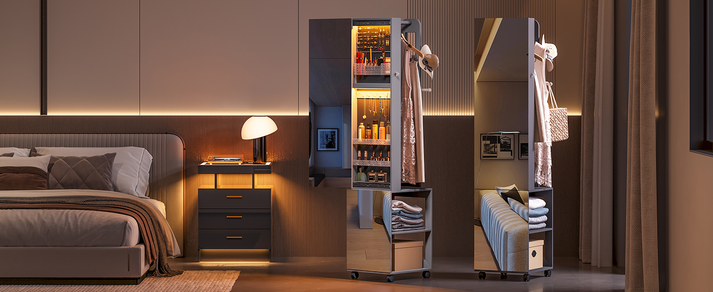 | Special Features | 3 Color Dimmable LED Strip, 360° Rotating and 4 Wheels, Classified Storage Space with 2 Rear Shelves, HD Full-Length Mirror Sliding, Upgraded Velvet Lining |