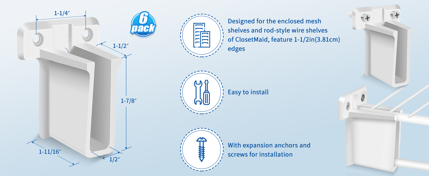 - Wire Shelf End Bracket: designed for wire rack type wardrobe system, with 1/2 inch thick closet shelf brackets, 1/2 inch long, 1-5/8 inch deep, wire bracket can be installed, convenient for your daily life