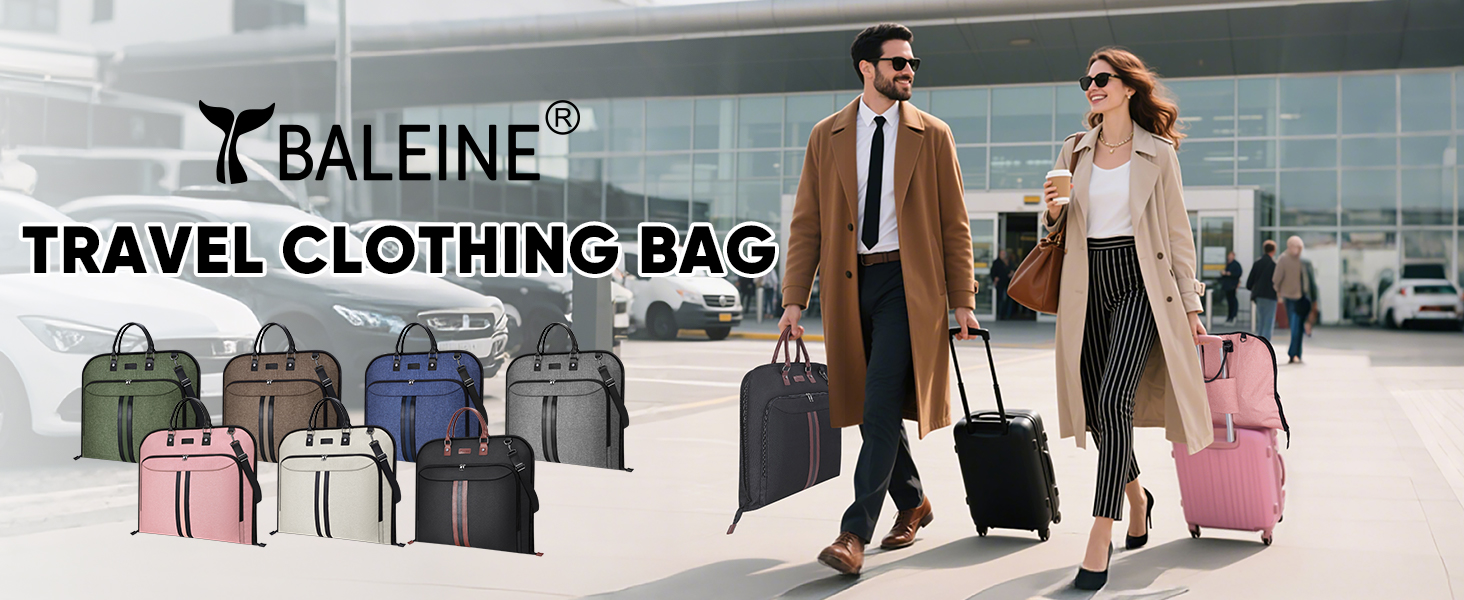 The BALEINE Travel Garment Bag is a 42'' waterproof, foldable suit carrier crafted from durable 300D water-resistant fabric. Designed for business travelers and event professionals, it features a compact fold, adjustable shoulder strap, and front pocket for essentials, ensuring wrinkle-free, stylish transport of your garments.