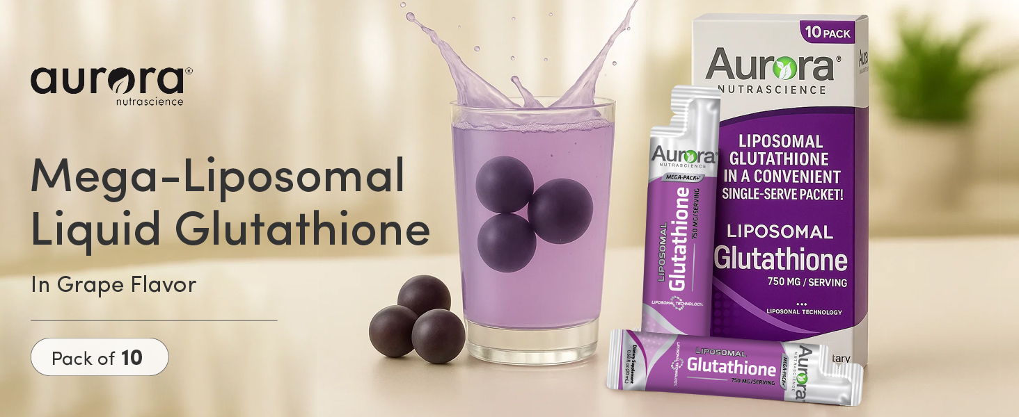 Vida Lifescience Aurora Nutrascience Mega-Liposomal Liquid Glutathione delivers 750mg of highly bioavailable glutathione per serving using advanced liposomal technology, ensuring up to 90% absorption. This non-GMO, sugar-free supplement supports immune health, liver detoxification, and skin radiance through potent antioxidant action, conveniently packaged in 10 single-serve liquid packets for easy daily use.