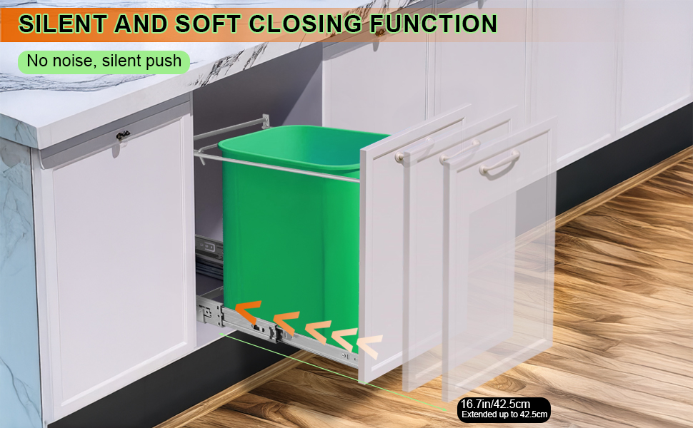 This under-cabinet pull-out trash can frame features a robust steel construction with nano-spray corrosion resistance, supporting up to 120 lbs. Its silent three-section steel ball slide ensures smooth, noise-free operation, while the compact design optimizes kitchen space by neatly concealing trash cans. Easy to install with detailed instructions and 24/7 support, it fits cabinets with a minimum opening of 11.5"W x 18"D and accommodates 15-45L trash cans (trash can not included).
