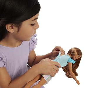 The My First Barbie 'Brooklyn' Doll is a 13.5-inch soft, poseable figure designed for preschoolers aged 2-6. Featuring easy-to-use dress closures, a textured headband, and a large brush for hair styling, it promotes fine motor skills and imaginative role play. The set includes a plush poodle with a wristlet for interactive nurturing adventures, inspired by the popular My First Barbie YouTube series.